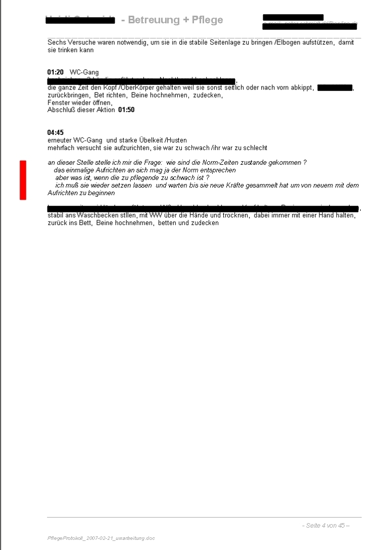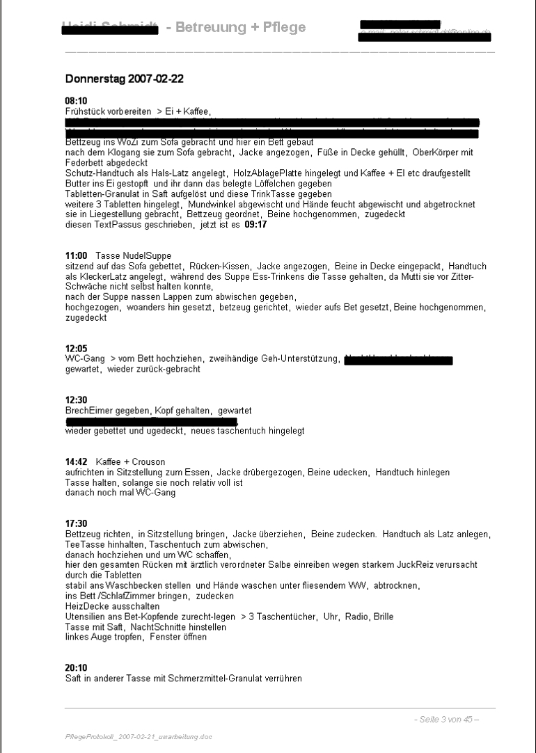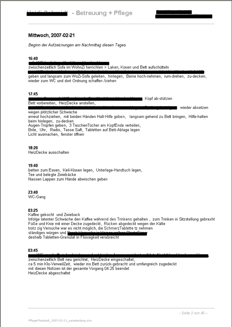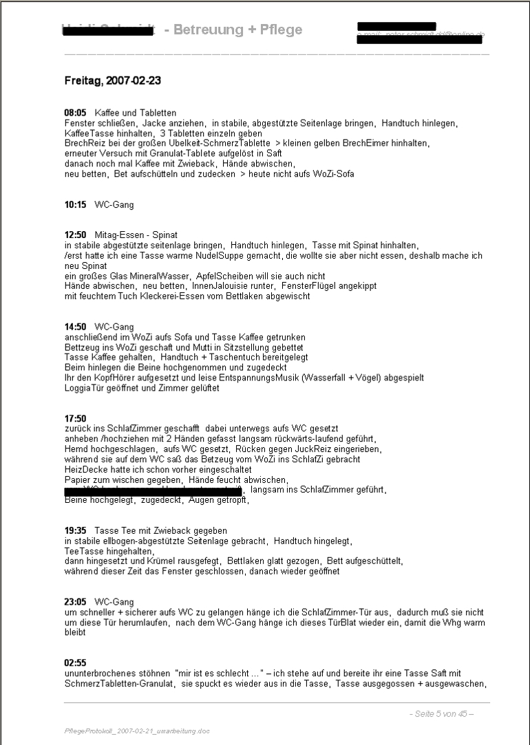 ReferenzUnterlagen in Sachen PflegeTätigkeit Pflege-Protokoll zur Pflege meiner Mutter > Zeitraum Mittwoch, 2007-02-21 bis Freitag, 2007-02-23 Grundlage sind immer meine handschriftlichen OriginalNotizen, die ich dann jeweils in einer, nicht mit Pflege-Leistungen ausgefüllten TagesZeit (meist nach Abschluß der jeweiligen PflegeAktion), in den Rechner eingetippt habe /für die PflegeVersicherung mußte das ja alles nachgewiesen werden es gibt bei diesen Texten sehr viele RechtschreibFehler bzw WortVerstümmelungen, das ist wohl auf meine damalige physisch und psychisch labile bzw angespannte Situation zurückzuführen hier geht es nur um die ersten drei Tage, die gesamte Dokumentation dieses 3-wöchigen ZeitAbschnitt ist 45 Seiten lang |
