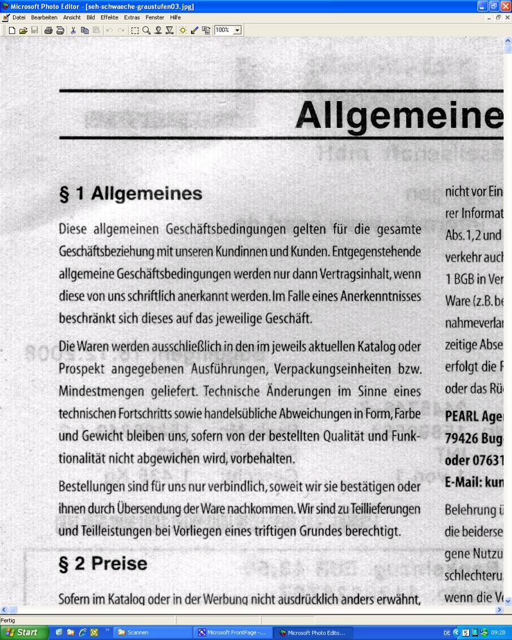 für Menschen mit Seh-Schwächen ein Demo-Beispiel, wie ein ganz einfacher Scan älteren Menschen /Menschen mit Seh-Schwächen helfen kann die Lesefähigkeit zu verbessern > zB das Grauton-Kleingedruckte auf weissem Papier besser lesbar zu machen man kann das sogar noch weitertreiben indem man nicht nur schlechthin scannt, sondern OCR lesen läßt > damit entsteht dann ein WORD-Dokument in das Sie Ihre Anmerkungen, Hervorhebungen, Passagen rauskopieren + löschen etc machen können also dann mit so einem kleingedruckten VertragsText wirklich praktisch arbeiten können |