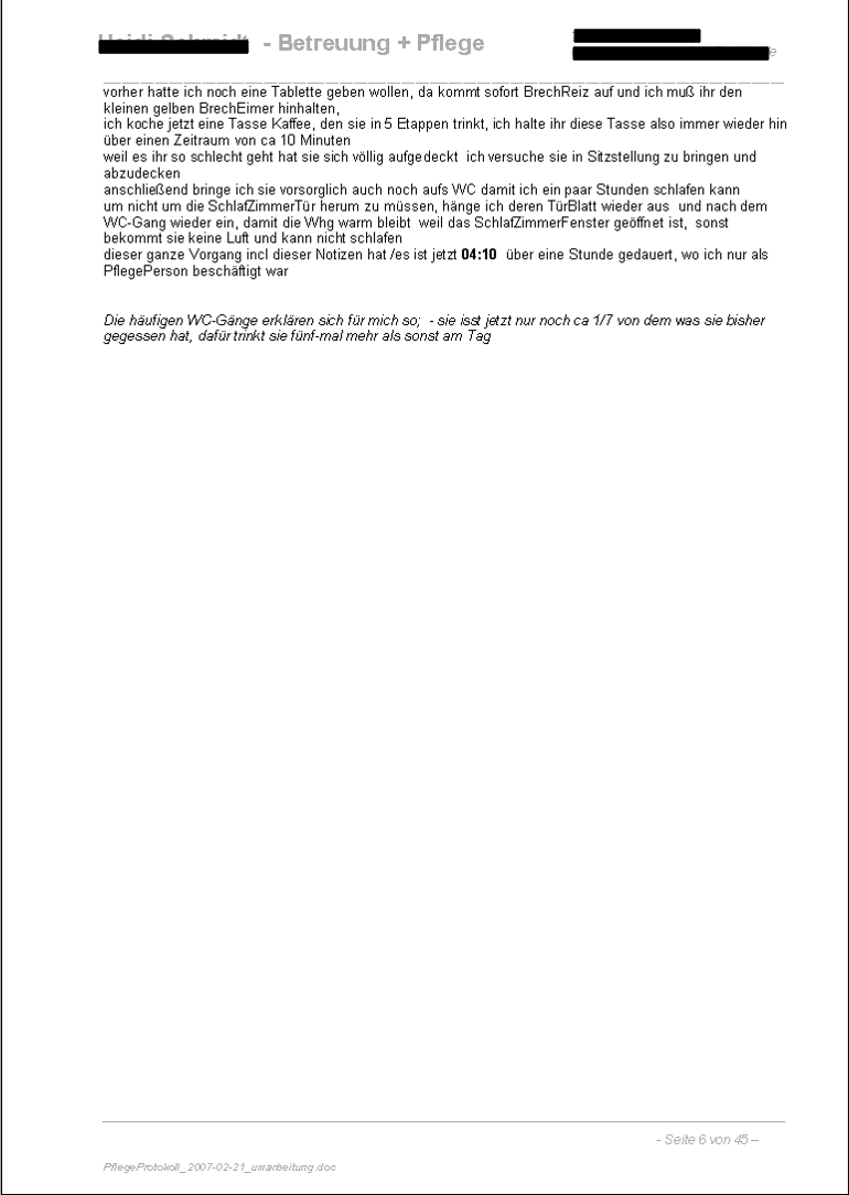 ReferenzUnterlagen in Sachen PflegeTätigkeit Pflege-Protokoll zur Pflege meiner Mutter > Zeitraum Mittwoch, 2007-02-21 bis Freitag, 2007-02-23 Grundlage sind immer meine handschriftlichen OriginalNotizen, die ich dann jeweils in einer, nicht mit Pflege-Leistungen ausgefüllten TagesZeit (meist nach Abschluß der jeweiligen PflegeAktion), in den Rechner eingetippt habe /für die PflegeVersicherung mußte das ja alles nachgewiesen werden es gibt bei diesen Texten sehr viele RechtschreibFehler bzw WortVerstümmelungen, das ist wohl auf meine damalige physisch und psychisch labile bzw angespannte Situation zurückzuführen hier geht es nur um die ersten drei Tage, die gesamte Dokumentation dieses 3-wöchigen ZeitAbschnitt ist 45 Seiten lang |